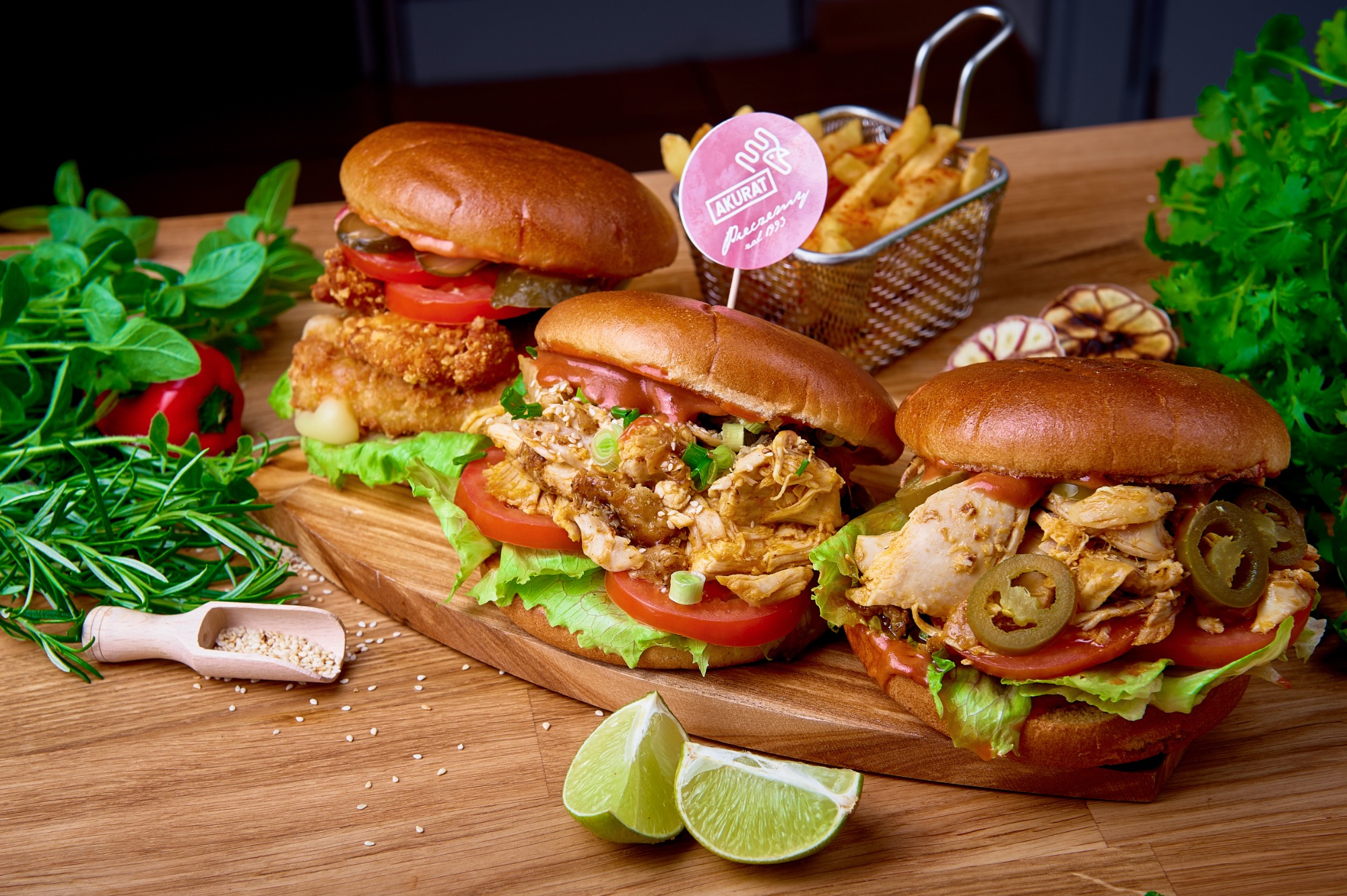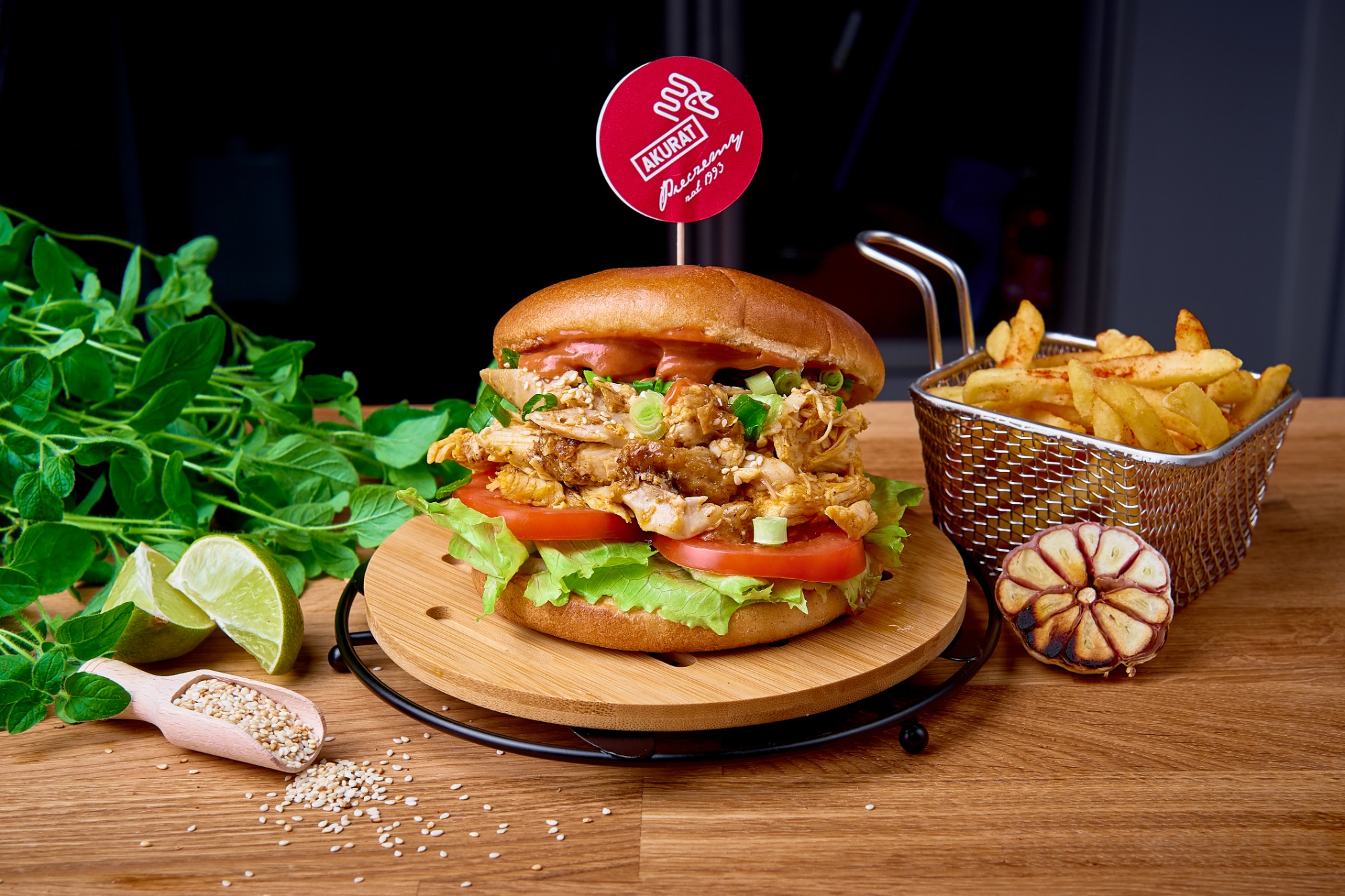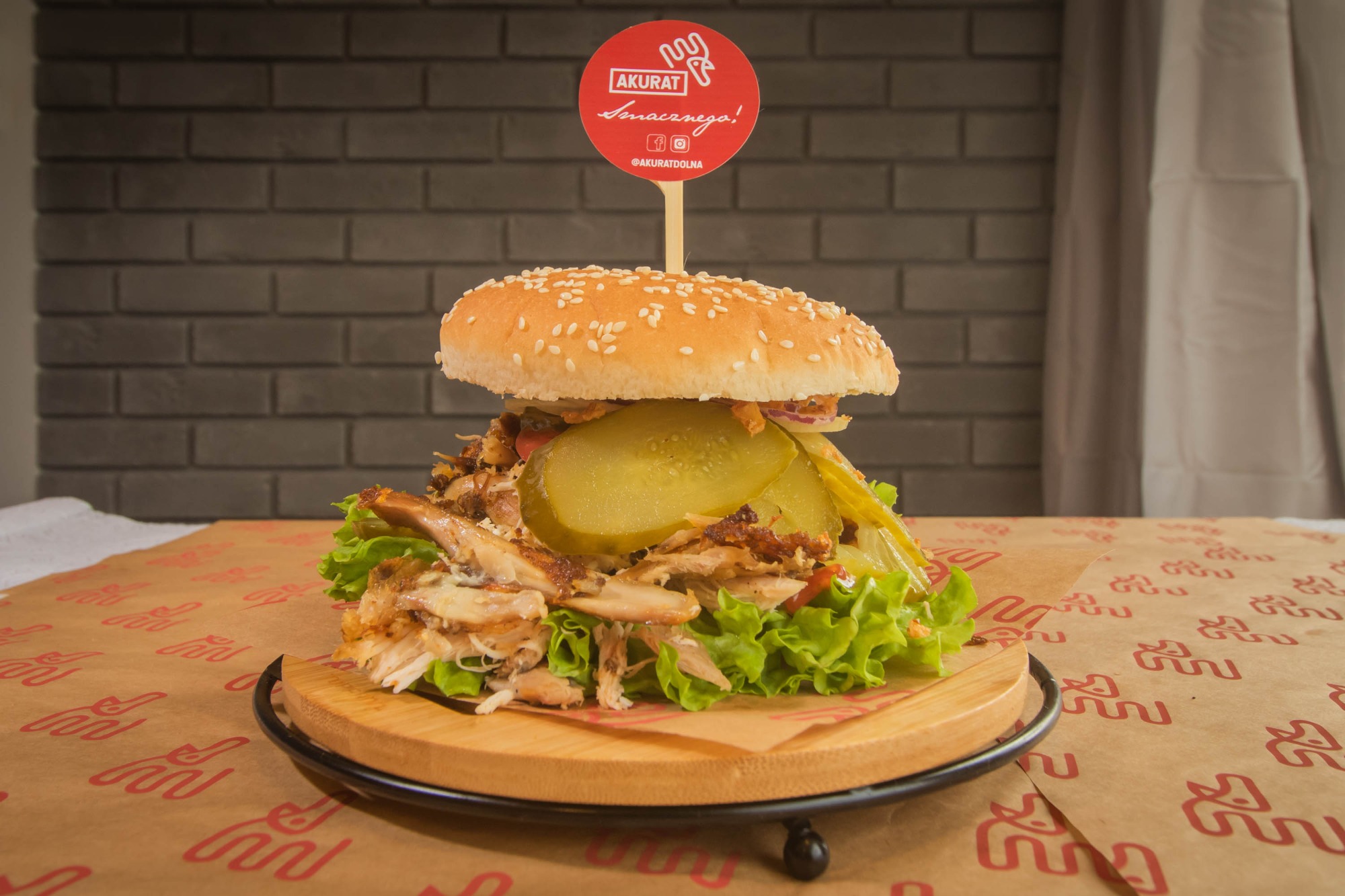 bułka, sałata, kotlet, pomidor, cebula, trzy rodzaje sosów - keczup, musztarda, remulada, prażona cebulka