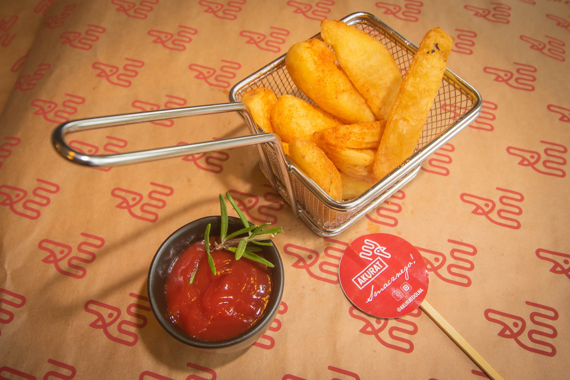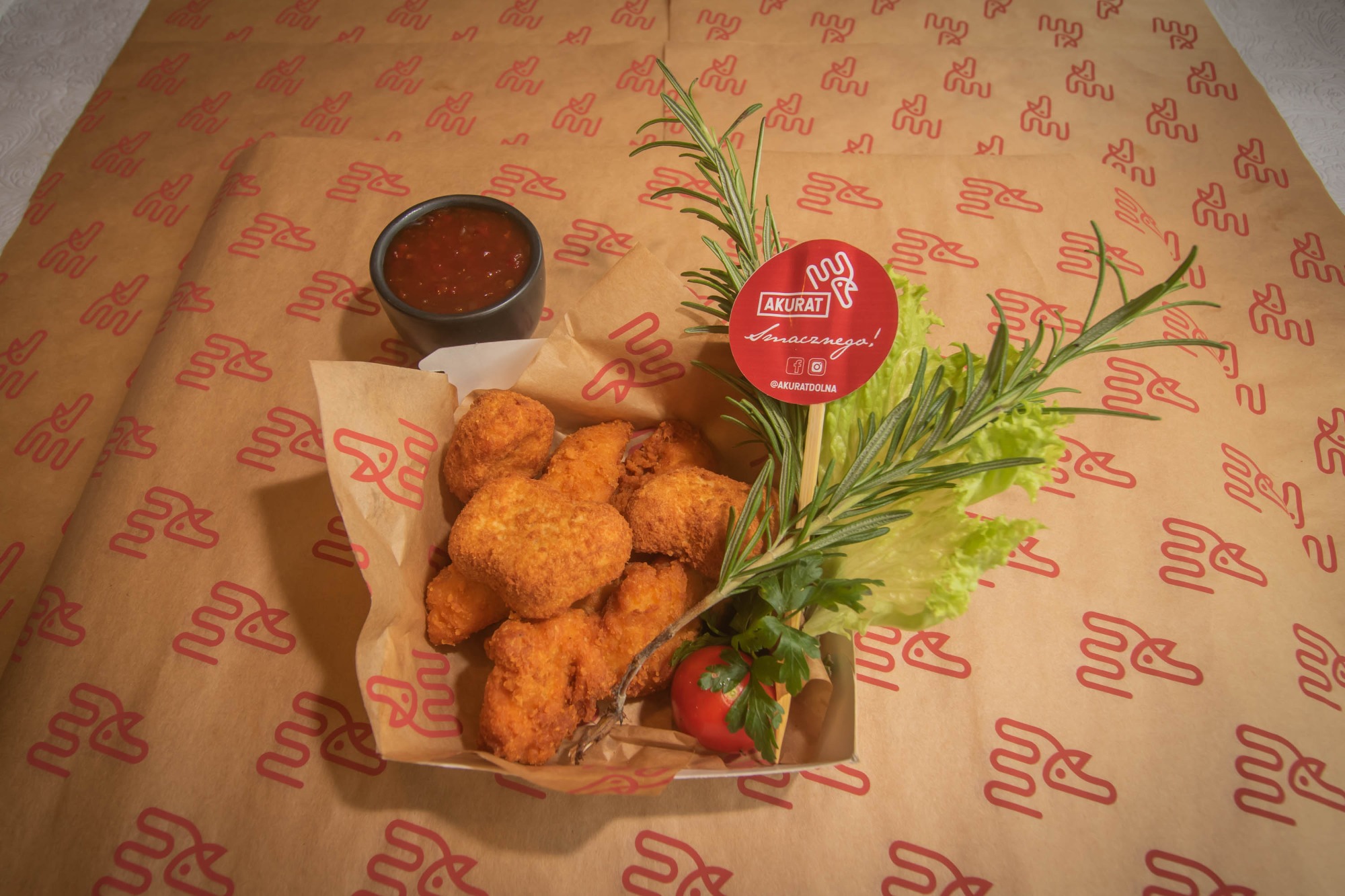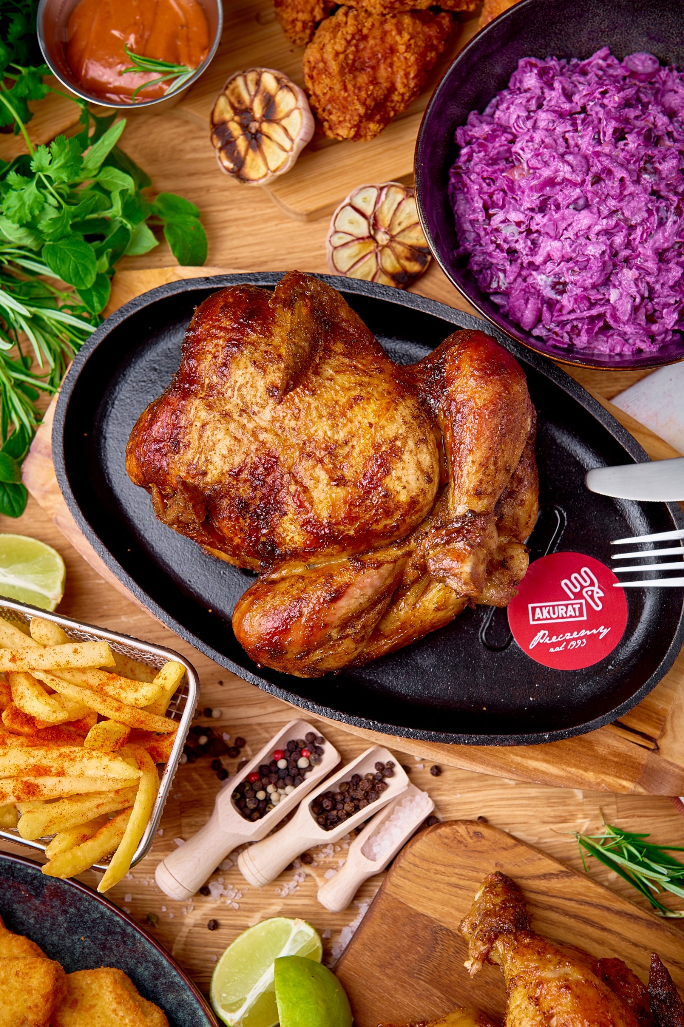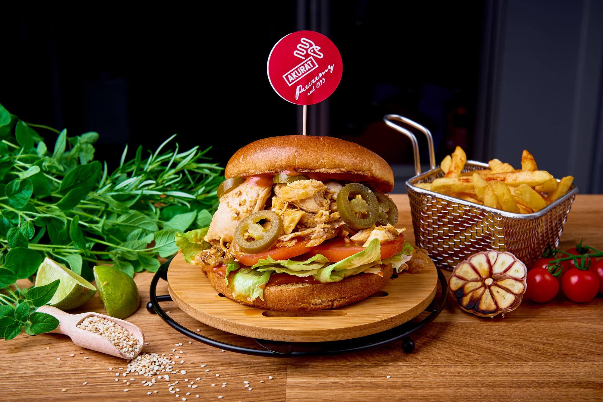 bułka, sałata, kotlet, pomidor, cebula, trzy rodzaje sosów - keczup, musztarda, remulada, prażona cebulka